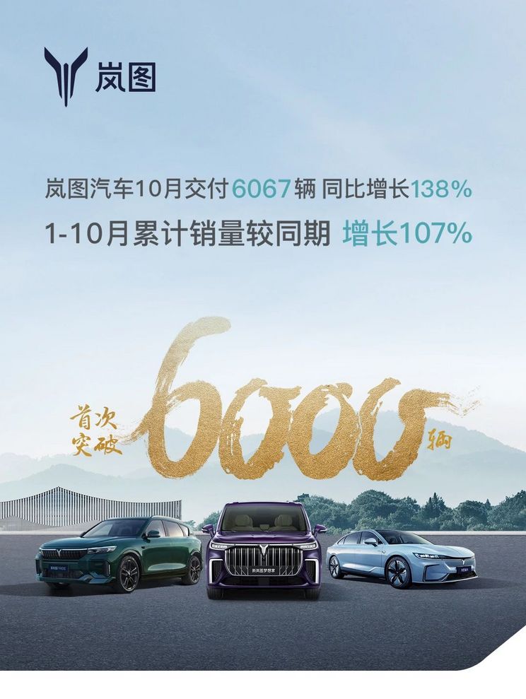 [本站 资讯] 11月1日,我们从官方获悉,岚图汽车10月共交付6067辆,同比增长138%,1-10月累计销量较同期增长107%。截止10月,其累计为用户充电超1亿642万度,减少碳排放超33268吨。