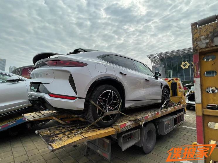 车辆尾部,下溜式的车顶线条让它的车尾部分看上去十分紧凑,尾灯采用流光瑞结设计,还会配备可升降后扰流板,车窗上部的扰流板看上去也相当运动,尾部两侧配备大尺寸的运动套件。