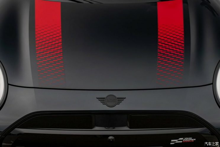 MINI Cooper SE JCW Trim拥有更加激进的外观设计,在黑色为主题的车身上,前机舱盖增加了红色的运动拉花,同时还拥有红色的车顶、外后视镜以及刹车卡钳。这款车的前脸也更具侵略性,八边形的前格栅内部采用高亮黑色装饰,并拥有JCW的赛车旗标识。在车尾,该车还加入了大尺寸的固定式后扰流板,让它的尾部相比于普通版本的MINI Cooper SE看上去会更加丰满。