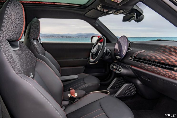除了外部的改变之外,JCW Trim还拥有一些内部的更新,包括采用合成皮革包覆并拥有红色缝线的运动座椅,仪表和门板上独特的黑色和红色主题。车内还加入了Go-Kart模式,在该模式下内部更广会变为红色,并会调整车辆的油门响应。