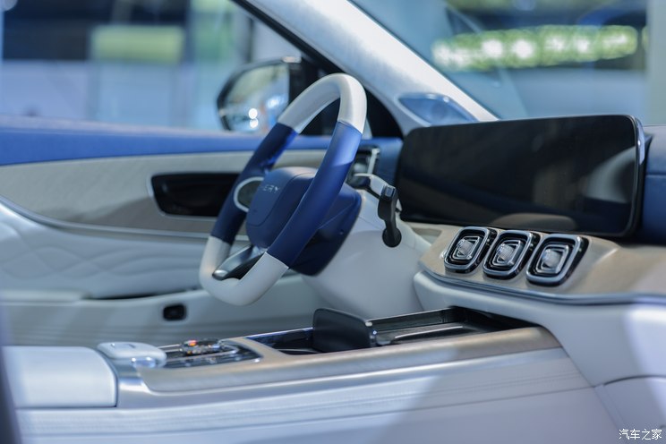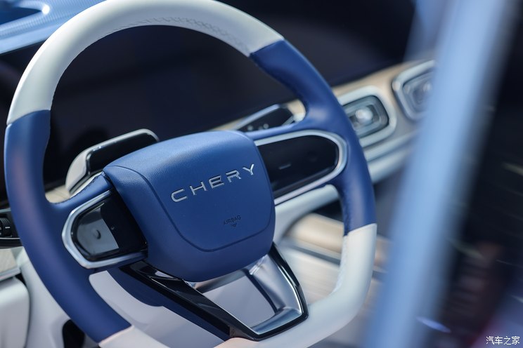 内饰方面,风云T9同样是延续瑞虎9的设计,但是车内的配色更加大胆,使用了蓝与白的配色,代表着清洁能源,车内还有大面积的木纹装饰修饰。车内中控台是一个贯穿式的中控屏设计,预计与瑞虎9配置相同,基于高通骁龙8155芯片+5G千兆以太网,带来较高的车机性能。