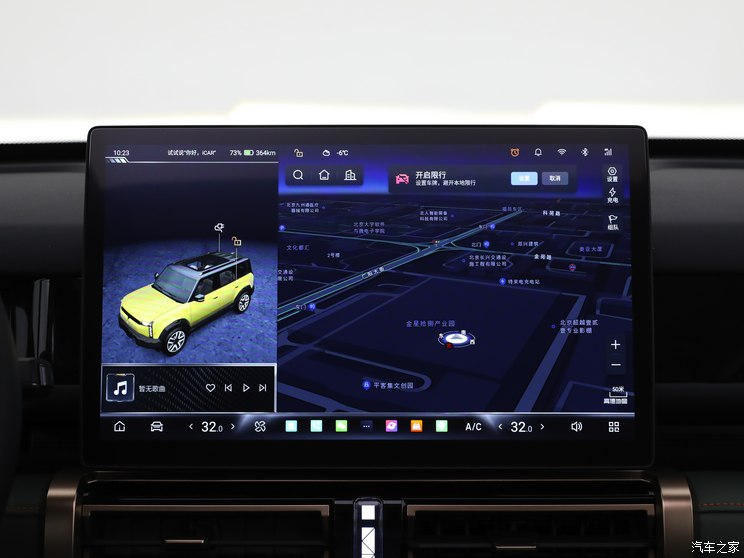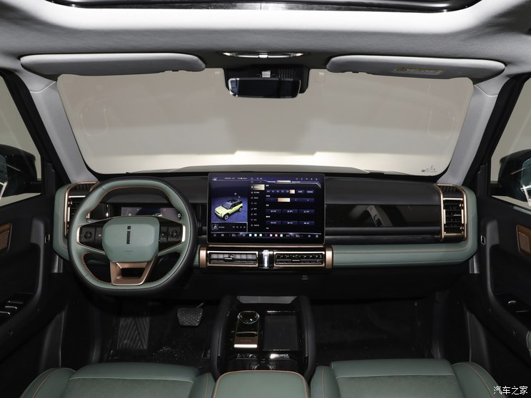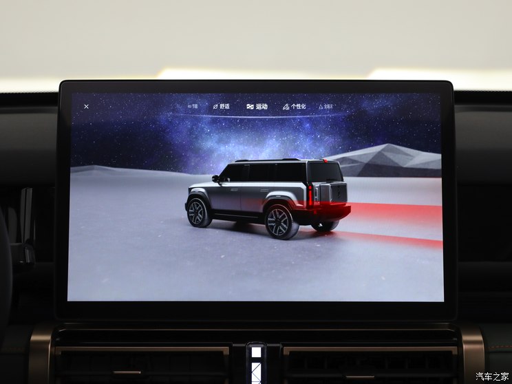 进入车内,新车采用的同样是十分硬派的设计风格,在多种配色以及材质的加持下,车辆内部展现出了与一般家用车不同的整体氛围。同时,新车在中控台布局方面延续了当前比较流行的设计思路,15.6英寸中控屏幕占据C位,但由于它独特的定位,新车中控台设计得比一般家用车型更“厚”一些,这也让设计简洁的中控台看上去没有那么单薄。