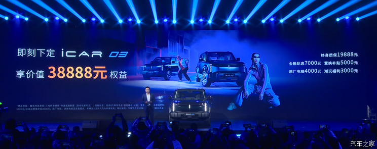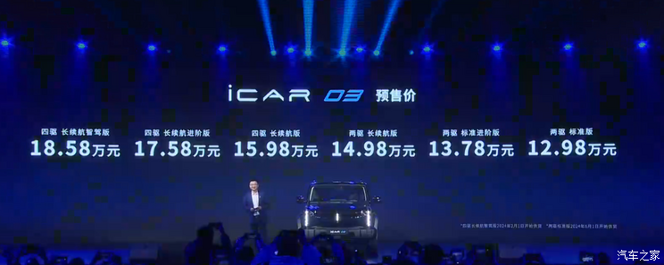 [本站 资讯] 12月18日,奇瑞新能源iCAR 03正式开启预售,新车共推出6款车型,预售价格区间为12.98-18.58万元,预售即交付。新车是一款采用“方盒子”造型设计的电动SUV,定位“潮盒电动SUV”,拥有相当时尚且硬朗的视觉感受。在看惯了一般的家用车之后,这种造型别致、展现个性的车型似乎也是一种不错的选择。