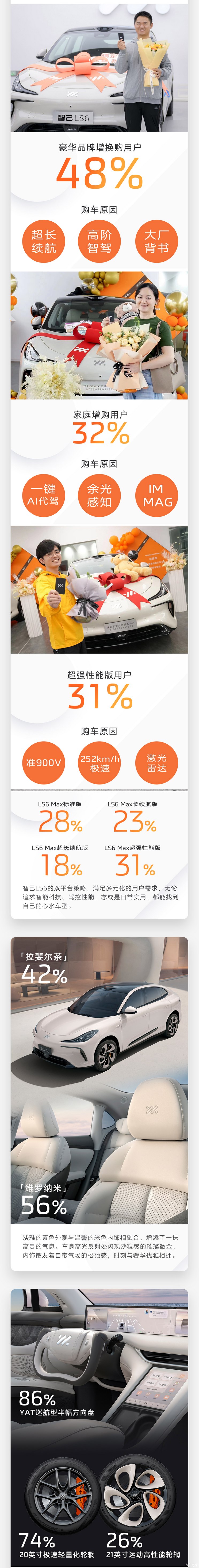 智己LS6的豪华品牌增换购用户比例高达48%,家庭增购用户32%。智己LS6的4款配置车型中,选择Max标准版用户占28%、Max长续航版占比23%、Max超强性能版占31%。另外有42%用户选择拉斐尔茶外观配色,56%用户选择维罗纳米内饰配色。YAT半幅方向盘选装率高达86%,还有74%的用户选择20英寸轻量化轮圈。