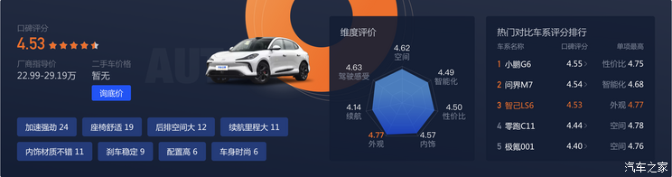竞品方面,智己LS6作为一款纯电动中大型SUV,它理应的对手其实应该是小鹏G9(售26.39-41.99万元)。不过也许是新能源消费者对于价格敏感度更高,因此小鹏G6(售20.99-27.69万元)则更多的被当做直接竞争对手。智己LS6价格虽然在两者之间,算上补贴后,相当于用小鹏G6的价格买到了近乎于小鹏G9的产品,自然会赢得更多消费者的青睐。