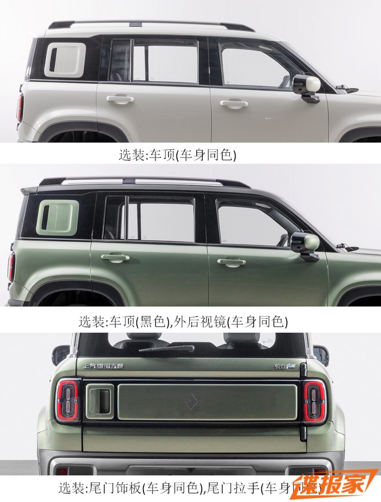 侧面整体上延续了方盒子造型,比起现款车型加长明显,从可爱范儿变成了稳重的风格。尾部也保留了现款经典的设计,采用了纵向布局的尾灯组,后备厢门为侧开式,后包围与前包围相呼应均采用了宽厚的越野风格,整体搭配非常协调。车身尺寸方面,新车3996/1760/1726mm,轴距2560mm,明显加长。