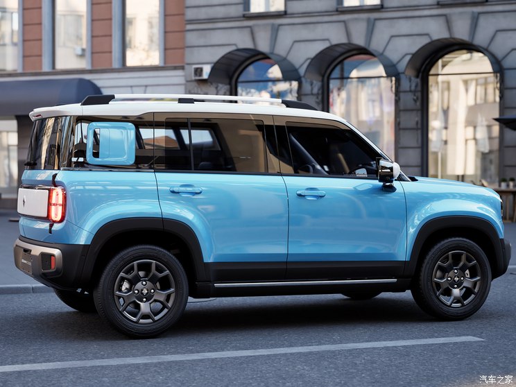 回顾外观,新车同样没有过多变化,依旧是方方正正的造型。相较于三门版车型轴距大幅提升,从2110mm加长到了2560mm。该车的C柱后方增加了一块车身同色的装饰板,风格上比较类似路虎卫士。此外车顶配备了行李架,轮圈也换成了全新的灰色双五辐轮圈。