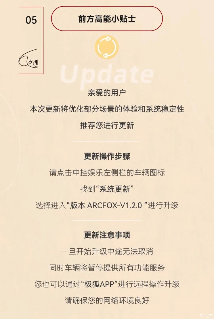 根据官方表示,本次更新将优化部分场景的体验和系统稳定性。用户需要点击中控娱乐左侧的车辆图标,找到「系统更新」,选择进入「版本ARCFOX-V1.2.0」进行升级。值得注意的是,一旦开始升级中途无法取消,同时车辆将暂停提供所有功能服务。同时,用户可以通过「极狐App」进行远程操作升级。