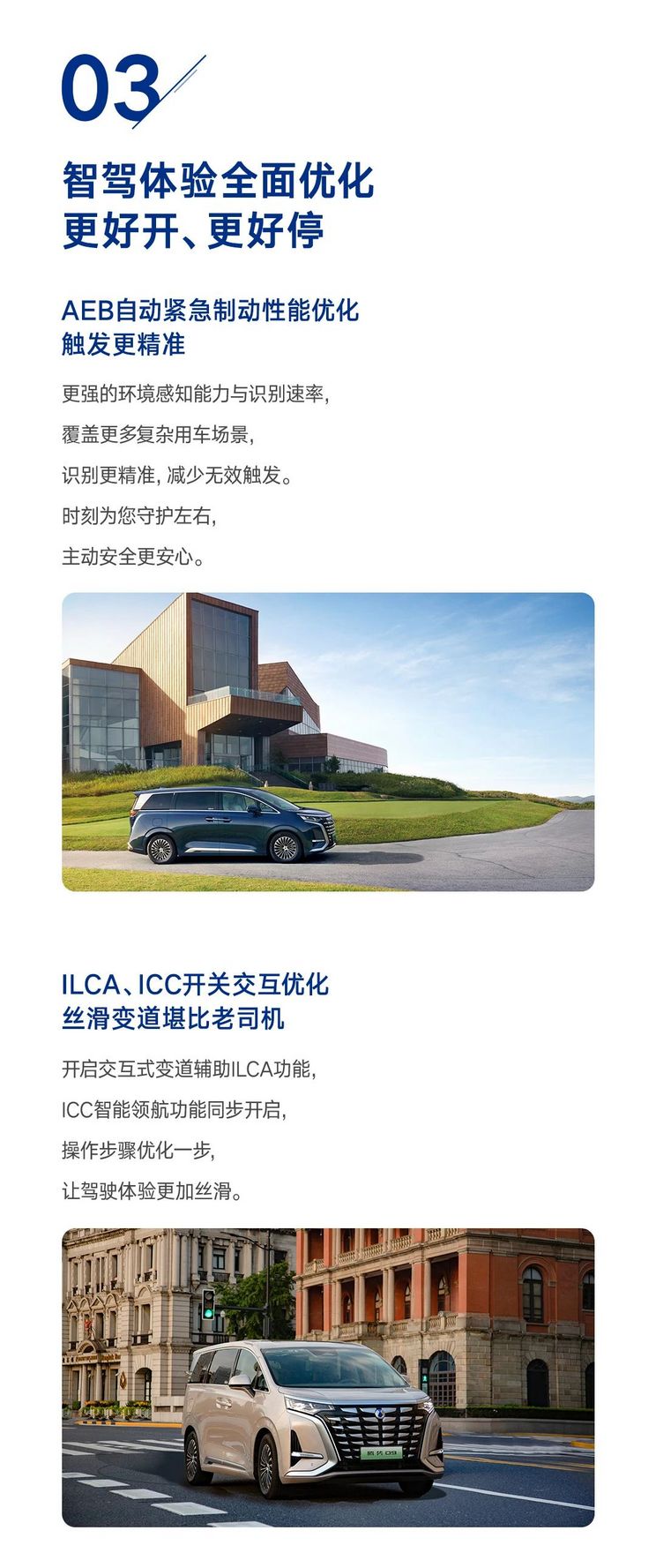 智驾体验方面,AEB自动紧急制动性能优化,触发更精准,拥有更强的环境感知能力与识别速率,覆盖更多复杂用车场景,识别更精准,减少无效触发。ILCA、ICC开关交互优化,开启交互式变道辅助ILCA功能时,ICC智能领航功能也会同步开启。IPA智能泊车辅助报警距离显示优化,优化智能泊车报警触发频次,减少无效报警提示,提高泊车驾驶舒适性。