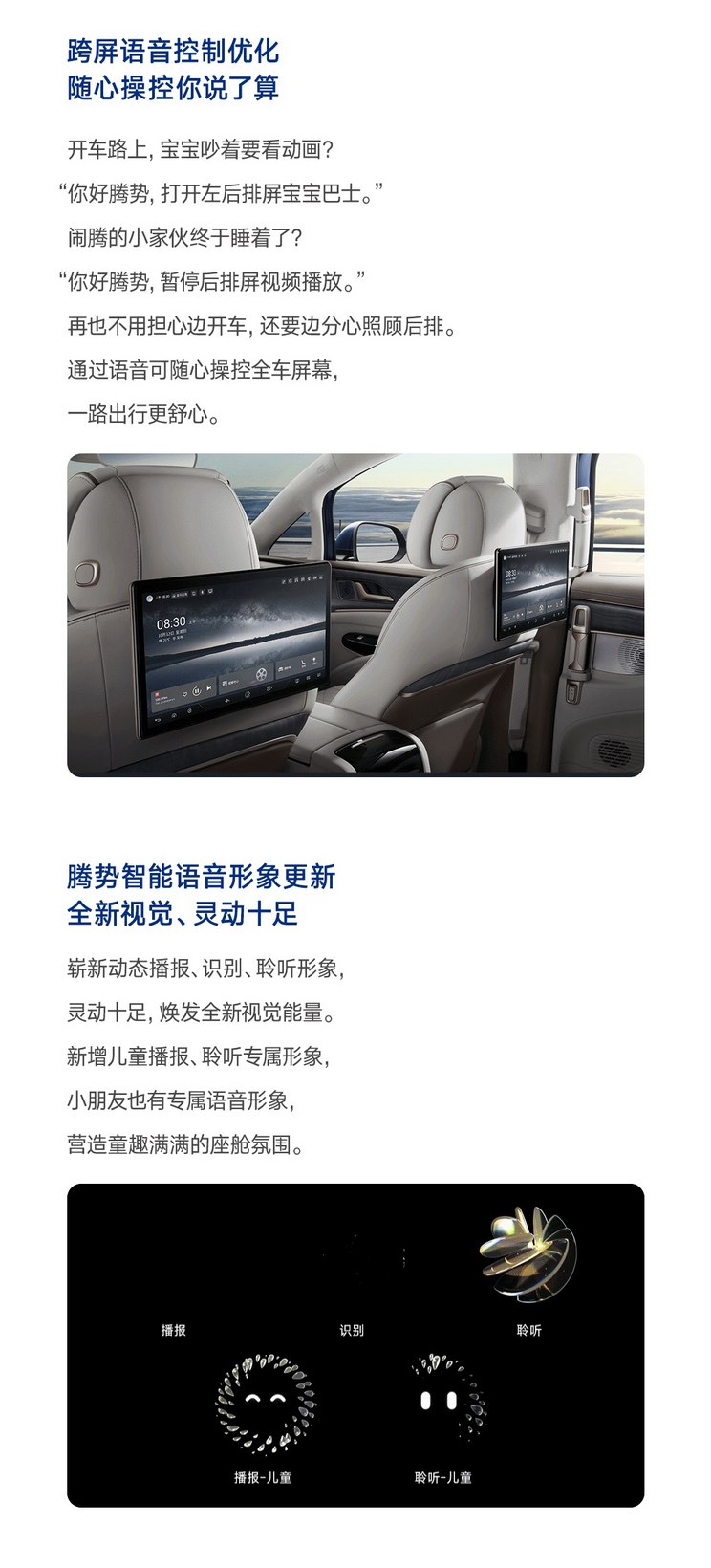 此外还新增了跨屏语音控制优化,通过语音可随时操控全车屏幕。腾势智能语音形象也迎来更新,新增儿童播报、聆听专属形象,小朋友也有专属语音形象。