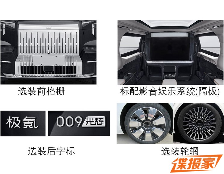 车尾的整体设计和现款保持一致,搭载贯穿式尾灯。区别在于车尾的极氪标志变为金色,右侧也配备了金色的009光辉标志,不过也可以选装银色。车身尺寸方面,该车的长宽高分别为5217/2024/1812mm,轴距为3205mm。此外可以看到新车标配后排影音娱乐系统和后排隔板,前格栅和轮圈也有不同样式可供选择。