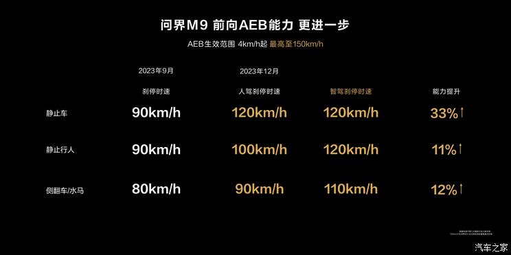 问界M9在主动安全更进一步,全车配备27个传感器,其中192线激光雷达拥有更强大的精准探测和快速响应能力,最远可探测距离达到250米,点频达到184万点/秒,扫描频率达到20Hz,将在2023年底实现全国有图无图都能开的高阶智能驾驶体验。HUAWEI ADS 2.0的AEB能力在面对静止车辆及行人,自动刹停速度最高达到120km/h;ESA紧急转向辅助(2024年Q2 OTA升级),自动控制转向辅助驾驶员避免碰撞;后向主动安全能力再增强,误踩油门也会制动(2024年Q1 OTA升级)。