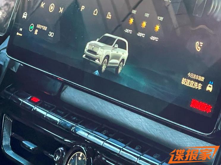 进入车内,本次新车内部基本上已经完全呈现在了镜头之下,预计基本达到量产状态。可以看到,新车配备了一块尺寸宽大的中控屏,下方保留了一排物理按键,空调出风口中间位置还配有时钟。从屏幕内部的模型我们可以隐约看到坦克800的外观细节设计。