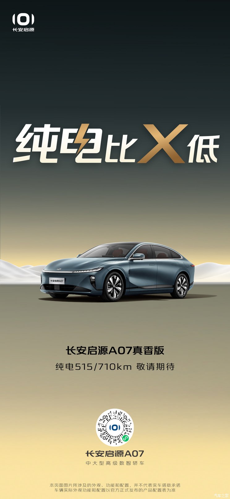 [本站 资讯] 2月22日,我们从官方了解到,长安启源旗下中大型轿车――启源A07真香版将于近日完成上市。此次将要上市的新车型是纯电版本,续航里程拥有515公里与710公里可选。目前现款纯电版共有4款在售车型,售价区间为16.69-17.99万元。