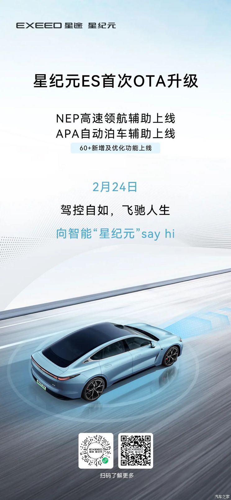 [本站 资讯] 2月23日,我们从星途官方了解到,旗下中大型车――星纪元 ES将于2月24日开启首次OTA升级,主要包含NEP高速领航辅助上线、APA自动泊车辅助上线以及60+新增及优化功能上线。