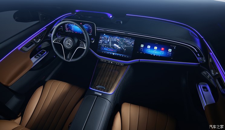 内饰部分,全新E 300 L尊贵型配备MBUX超级屏,包含14.4英寸中央显示屏和12.3英寸前排乘客显示屏。全新E 260 L 4MATIC采用12.3英寸独立全液晶仪表屏加14.4英寸中央显示屏的双屏设计,可搭配“璀璨星河”木饰板/MANUFAKTUR带流线装饰的黑色钢琴漆饰件/开孔型黑色岑木木饰板/带铝制线条的棕色开孔型枫木木饰板,呈现出不同风格的豪华质感,满足客户的个性化审美。