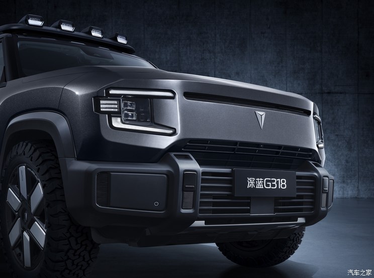 外观方面,该车拥有方正的轮廓,清晰立体的线条造型,营造出典型的硬朗形象。具体来看,深蓝G318非常强调金属多边形的切削,整体设计上呈现出与传统硬派车型完全不同的科技硬派观感。同时,造型别致的大灯组,配备中央封闭式前格栅,让这款车看上去十分科幻且时尚。此外,其下包围处疑似拥有充满野性的护板设计。