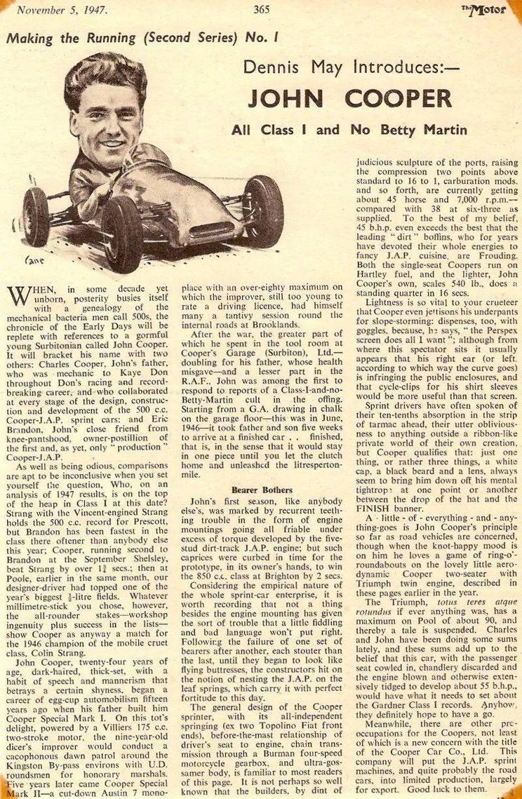 John Cooper生于1923年,他的父亲Charles Cooper经营着一家小型汽车维修厂,专门负责为赛车提供保养维护。年幼的John Cooper就是在各种汽车、配件以及车手、机师的陪伴中度过了自己的童年。15岁时,他便放弃学业,成为了一名机械工厂学徒。第二次大战期间,John Cooper曾以机械师的身份服务于皇家空军。