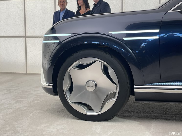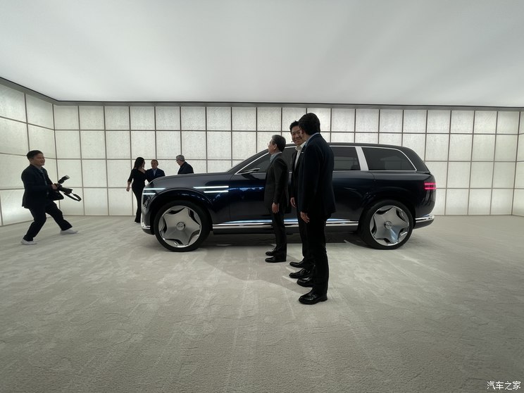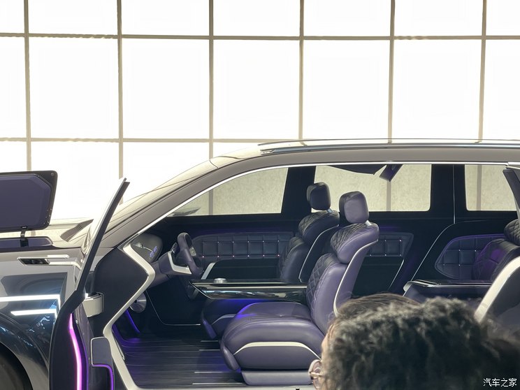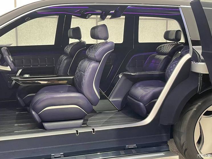车身侧面最显著特点是采用了无B柱对开门设计,提供更加开放和富余的内部空间,据悉无B柱对开门设计已达到量产水平。车身尺寸方面,新车长宽高为5253/2097/1836mm,轴距为3297mm。轮圈方面,新车配备24英寸轮圈。