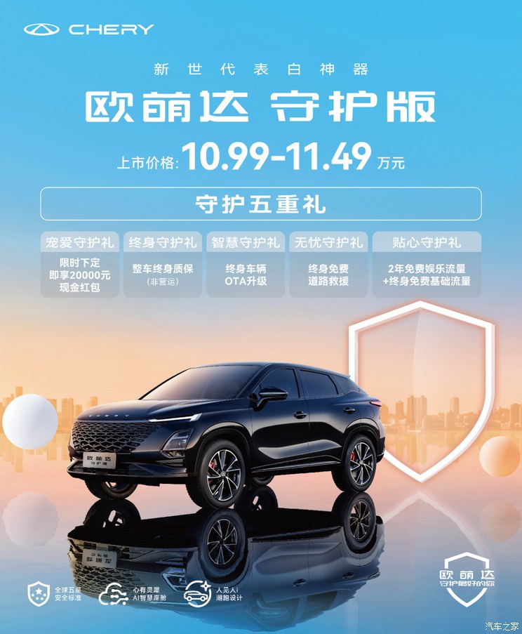 正式上市后,欧萌达守护版限时享受2万现金红包,同时还准备五大购车守护礼,让用户购车无忧――宠爱守护礼:限时下定即享 20000元现金红包;终身守护礼:整车终身质保(非营运);智慧守护礼:终身车辆OTA升级;无忧守护礼:终身免费道路救援;贴心守护礼:2年免费娱乐流量+终身免费基础流量。