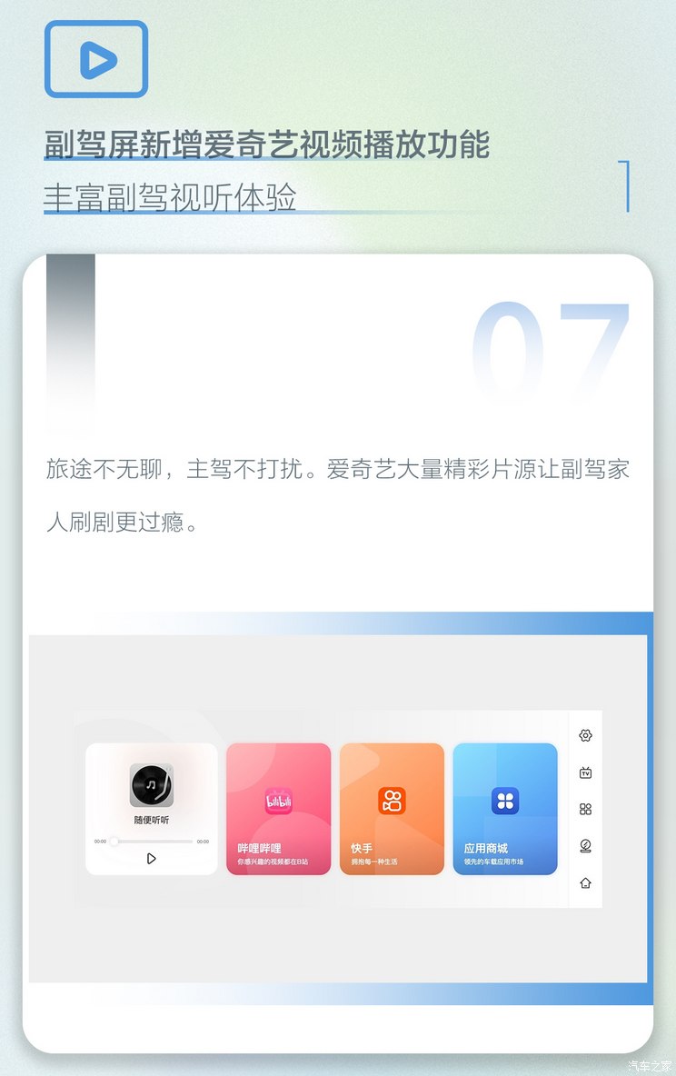 副驾屏新增爱奇艺视频播放功能;AR-HUD焕新:1、全新AR-HUD界面,显示更美观。2、新增场景重构显示、挡位显示(静止状态下)、驾驶能量流显示和转向指示灯显示,行车更具实用性。3、新增车机端自定义开关功能,包含导航信息显示、盲区并线辅助、行人及车辆标记、场景重构等8个开关功能。