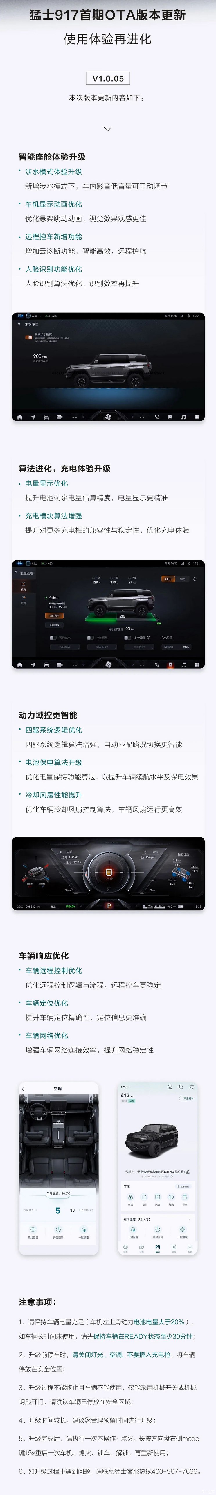 猛士宣布猛士917车型推送首期OTA更新,版本为V1.0.05。此次更新将会在智能座舱、充电体验、动力、车辆响应几大方面进行提升(官方通告见文末)。