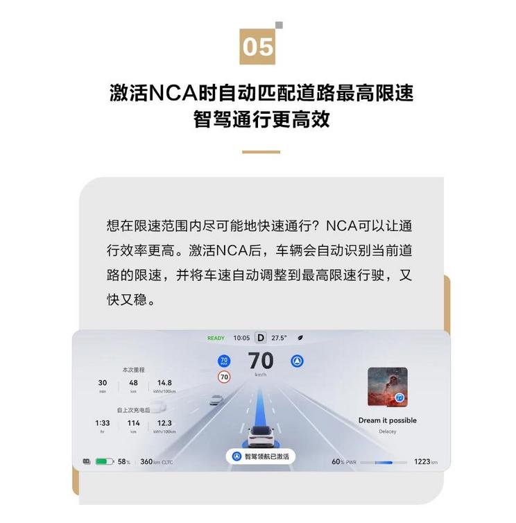 官方的升级说明显示,此次OTA升级的一大关注点是将推送城区智驾领航辅助(城区NCA)。城区NCA可以辅助驾驶员控制车辆按导航路线自主行驶至目的地,具备自主换道、自主左右转、看红绿灯过路口、遇到斑马线礼让行人、避让异性障碍物、机非混行场景提前预知判断等能力。不依赖高精地图,城区NCA支持全国的高速、高架、快速路;支持大小城市及乡镇的城区道路;支持城市所有道路(主干路/次干路/支路等)、国道、县道、乡道等公开道路,可用路段高达99%,全国都能开,越开越好看,有路就能开。