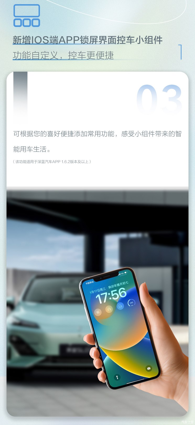 3、新增iOS端App锁屏界面控车小组件。(该功能适用于深蓝汽车App 1.6.2及以上版本)