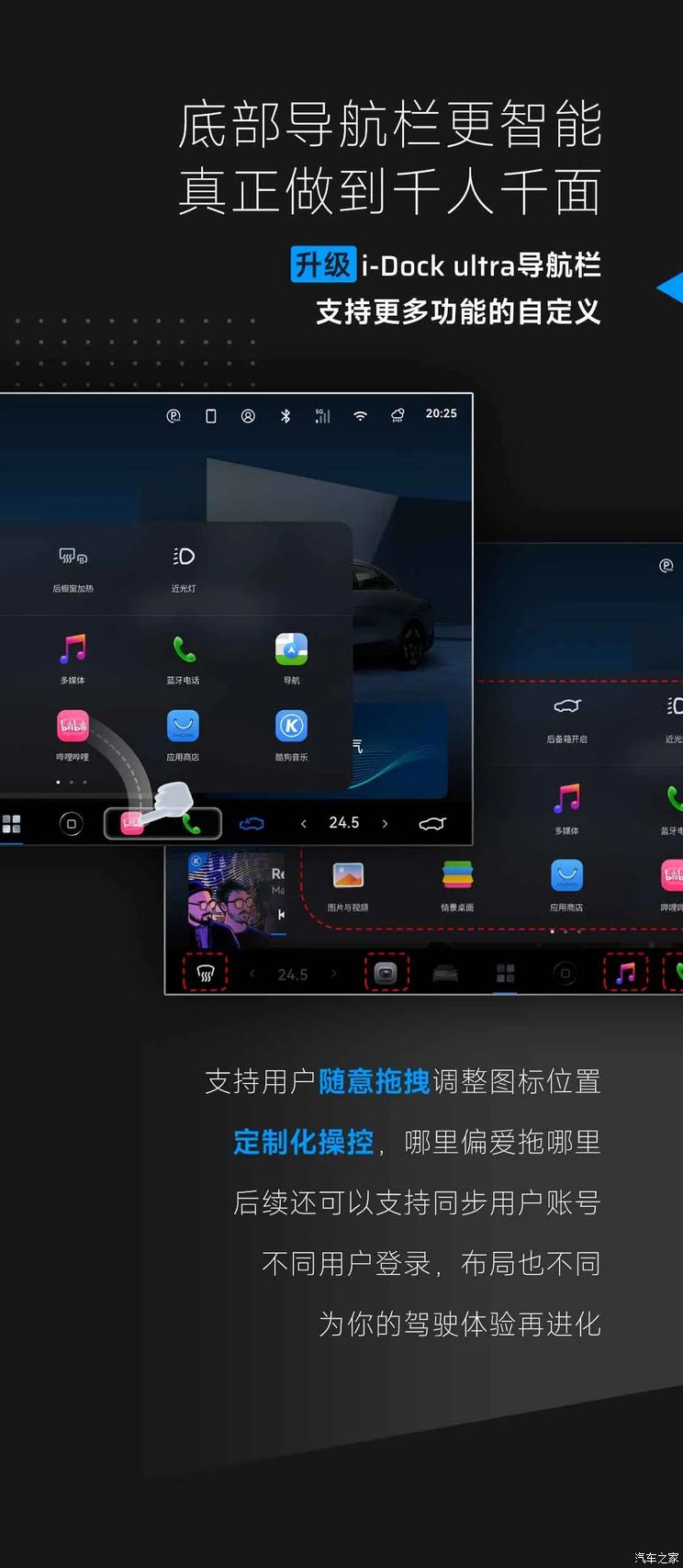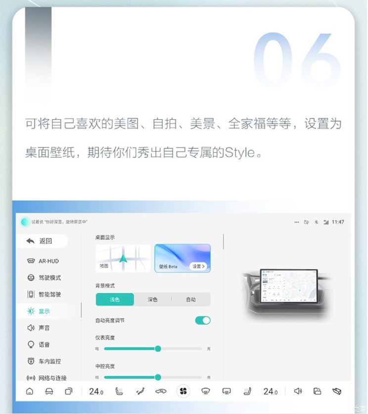 新增车机端应用生态:车机端上线“智能儿童座椅”、“酷咖游戏”等应用生态,带来更多元的驾乘趣味。可将自己喜欢的美图、自拍、美景、全家福等等,设置为桌面壁纸。
