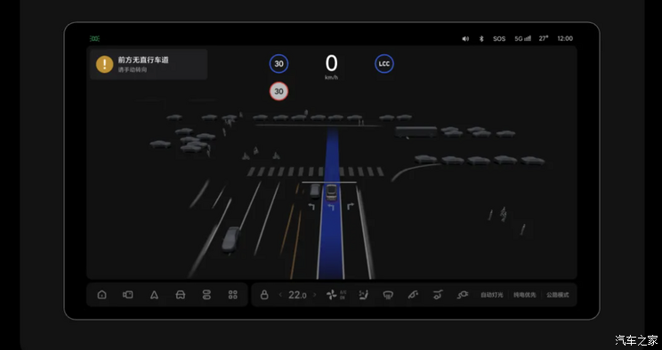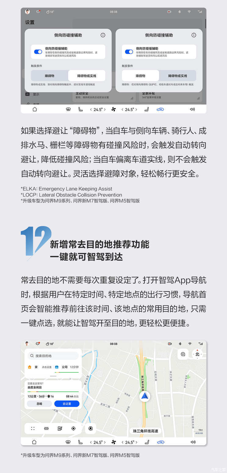 此外,ADS(高阶智能驾驶系统)新增脱手提醒选项,增加标准、舒适两个选项,同时还新增常去地点快捷导航推荐功能,在导航首页会智能推荐常用目的地,实现一键智驾。本次OTA针对ADS侧向主动安全系统进行升级:新增侧向主动安全功能LOCP,当车辆存在与侧向成排水马、栅栏等障碍物碰撞的风险时,系统将自动触发紧急干预自动转向,规避或减轻碰撞风险。此外,侧向防碰撞功能配置项还增加障碍物和实线选项。