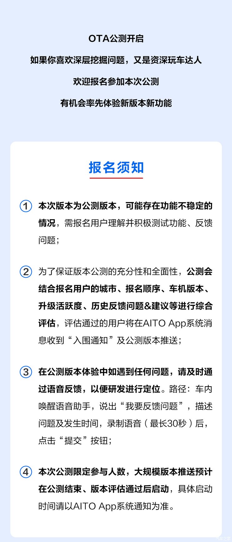 我们从官方获悉,问界汽车3月份将迎来OTA 3.3.9.1/4.2.0.7版本的发布,目前公测活动正式启动。智驾版系列OTA公测覆盖5个车型:问界M5智驾版、问界M5纯电智驾版、问界M7 Max版、问界M9增程版、问界M9纯电版。目前本次版本公测于2024年3月12日20点开启报名,大规模版本推送将在公测结束、版本评估通过后启动。
