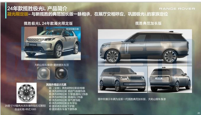 近日,2024款路虎揽胜极光L配置信息曝光,包括插电混动版在内新车将推出4款车型,取消了科林斯古铜特别版,同时新增凝光限定版(中国限定),采用大屿山铜车身+夏朗德灰车顶相搭配。2024款车型的重要变化在于将双10.2英寸中控屏改为一块11.4英寸中控屏,并进行了多项配置升级。预计新车将于4月份正式上市,目前已开始接受预订,享受1万订金抵扣2万购车款的优惠政策。