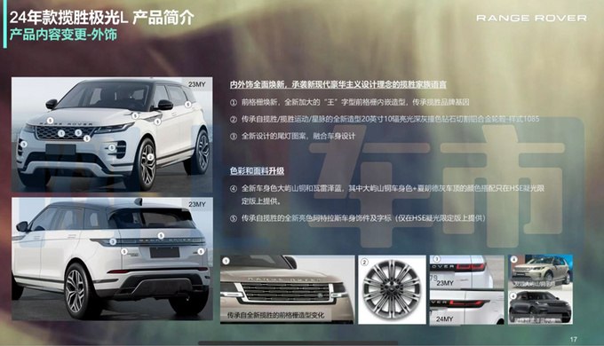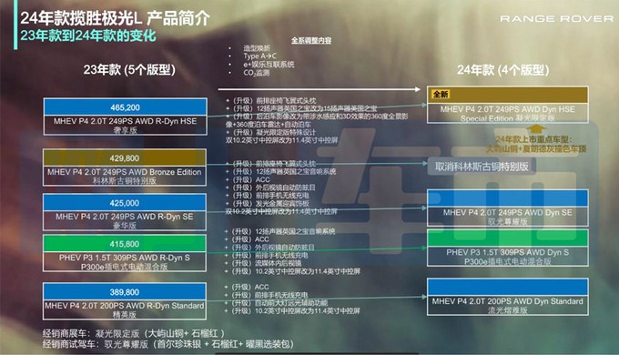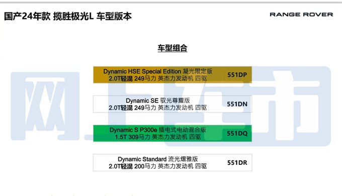 动力方面,预计2024款揽胜极光L将沿用现款动力,搭载2.0T+48V轻混系统,匹配9速手自一体变速箱,并配备四驱系统。混动版搭载1.5T三缸发动机+电机组成的插混系统,系统综合功率227kW。