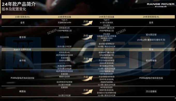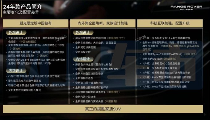 内饰以及配置方面是此次新款车型变化较大的地方,新车全系标配前排手机无线充电、ACC自适应巡航、Type-C快充接口等配置。现款的Type A接口调整为C接口,增加e+娱乐互联系统,二氧化碳监测。凝光限定版相比现款奢享版升级了前排座椅头枕、15扬声器英国之宝、360°全景影像、自动泊车、11.4英寸悬浮式中控屏等。插电混动版相比现款增加了前排手机无线充电、11.4英寸悬浮式中控屏、ACC自适应巡航、12扬声器英国之宝等。