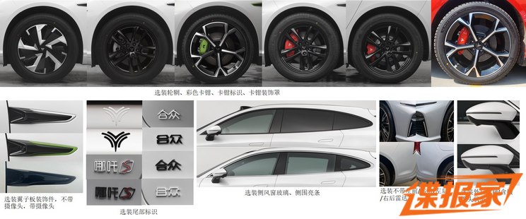 外观来看,增程版和纯电版共用一套前脸,新车采用分体式大灯,造型和哪吒S三厢版保持一致,车头两侧的三角形区域上半部分是大灯组,下方则是熏黑装饰,使前脸看起来很有攻击性。新车配备了双五辐熏黑轮圈,刹车卡钳有灰色、绿色和红色可选。