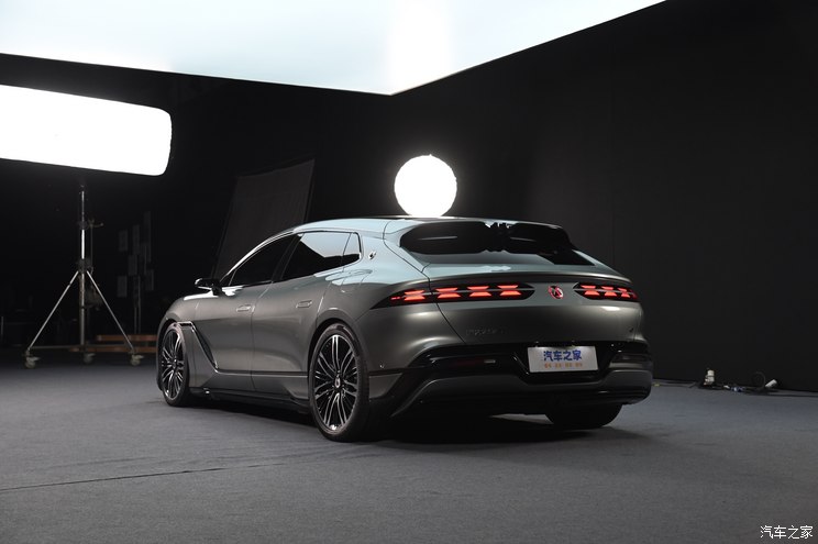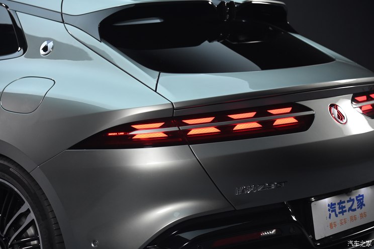 车尾部分,腾势Z9GT呈现出整体溜背(FASTBACK)的尾部姿态,配备飞行器式车顶镂空扰流板以及主动式车尾扰流板,并配备高位刹车灯以及低位领航灯,展现出不错的运动属性。车辆尾部横向的线条设计,使其在视觉上更为低矮宽阔,并以对称的秩序感与前脸进行呼应。此外,新车采用命名为“时光沙漏”的尾灯设计,由中间向两侧延伸,轮廓与表面结合。尾灯设计灵感源于流沙型沙漏,以沙漏的形状为基础,强调流动与视觉平衡,同时也更注重对称性,呈现出上下部分的平衡。车身尺寸方面,新车长宽高分别为5180/1990/1500(1480)mm,轴距为3125mm。