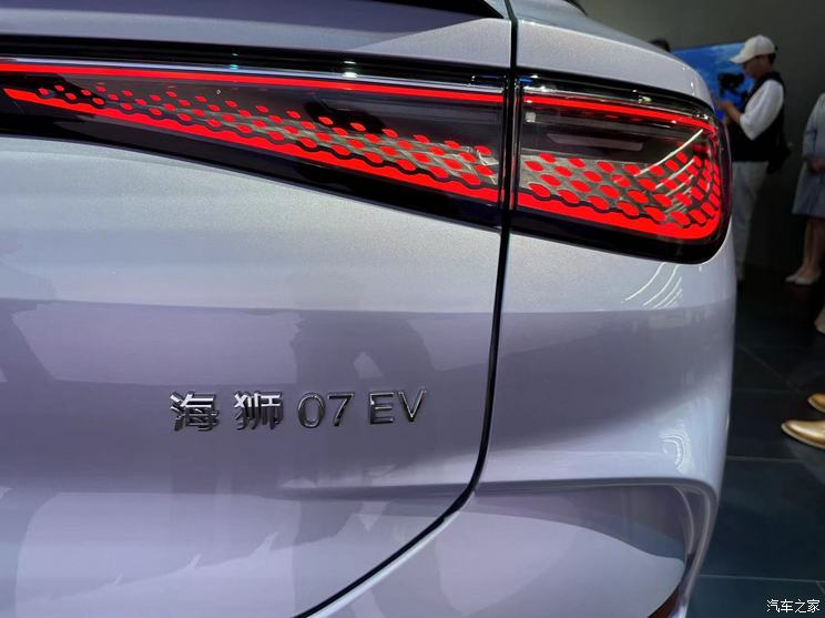 车身侧面来看,海狮07 EV舒展的车身比例给人以很强的空间想象力,车顶优美流畅的曲线延伸至车尾,形成溜背式设计,视觉效果突出。尾部方面,丰富的直线与灵动的曲线相互交织,构成极强的视觉冲击力。多条横向线条与侧面的腰线浑然一体,强化了车体的视觉宽度。同时,当下流行的贯穿式尾灯的加入,丰富层次感。