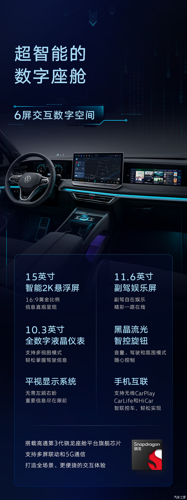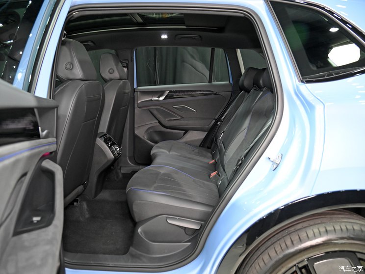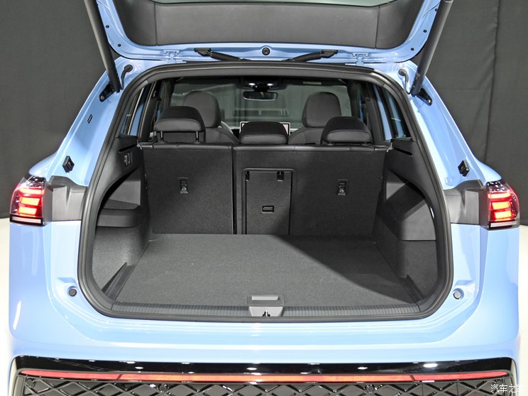内饰部分,新车整体设计更强调运动感和座舱科技感。其采用15英寸中控屏+10.3英寸数字仪表,对比海外版车型,国产版加入了11.6英寸副驾娱乐屏。新势力常用的怀挡设计,这次也出现在了途观L PRO的身上,空闲出来的换挡位置,由一个旋钮屏替代。座椅以及中控采用蓝色缝线点缀,顶配版车型中控以及座椅还采用Alcantara材质,展现出不错的精致运动感。此外,新车后排座椅的中央扶手区域还可单独放倒,方便在车内拿取后备厢物品。