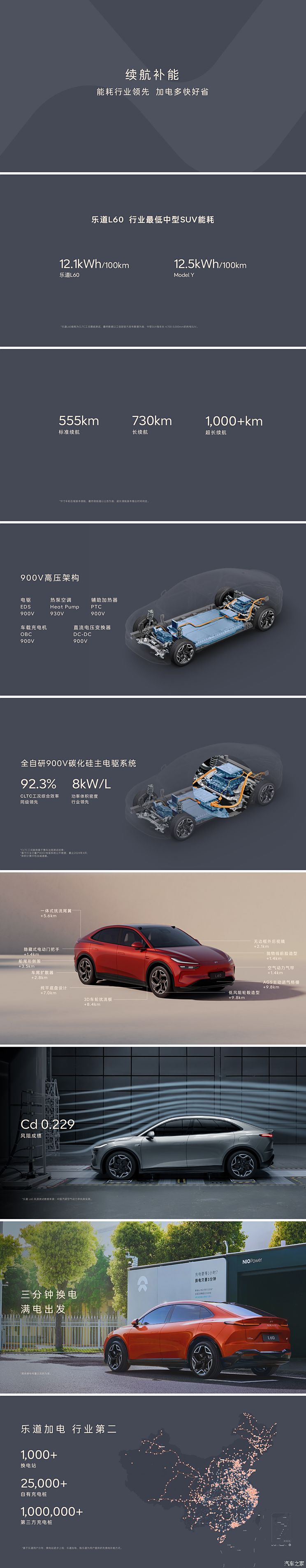 新车采用前麦弗逊+后五连杆式独立悬架,拥有FSD可变阻尼悬架,转弯直径只有10.8m。同时,该车智驾部分,据官方表示乐道L60可以做到交付即可用的纯视觉智能驾驶解决方案,其全系标配30个高性能感知硬件,其中包含1颗4D成像毫米波雷达,最远探测距离达370m;7颗800万像素高清摄像头,前向最远探测距离为687m;4颗星光360度摄像头,低至12lux照度依旧可以看清。动力方面,乐道全系车型将基于蔚来第三代技术平台NT3.0进行开发,并将与蔚来共享换电网络。具体来看,乐道L60将全系基于900V碳化硅平台打造,将采用BaaS电池租赁方案,日常通勤采用75kWh和100kWh电池组,长途出行可通过换电更换150kWh电池组,续航里程分别为555km、730km和1000+km。
