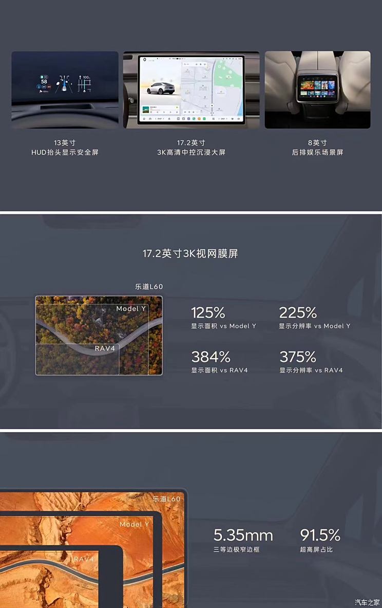 内饰方面,乐道L60将采用环抱式舒享空间设计理念,其将配备17.2英寸3K视网膜级中控屏(屏幕采用DCI-P3色域标准,拥有10bit色深,能够显示10.7亿色,屏幕峰值亮度超过12000nits,并拥有防反射、抗指纹、防眩光,同时该屏幕三等边均为5.35mm),并拥有16:10的呈现比例,配合极简风格的中控台设计,在满足日常用车需求的同时,也大大提升了车辆的驾乘舒适感。同时,新车还将配备环舱光瀑式氛围灯、13英寸HUD抬头显示。