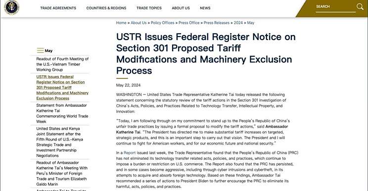 美国贸易代表办公室称,上述关税新规针对“中国占据主导地位的产品,或者是美国最近进行了大量投资的行业产品”。相关公众意见征询期为期30天,于6月28日结束。此外,美国贸易代表办公室在另一则通知中提供了有关企业如何申请机械设备关税豁免的细节,同时表示,任何获得的豁免都将即日起(5月22日)开始,至2025年5月31日结束。