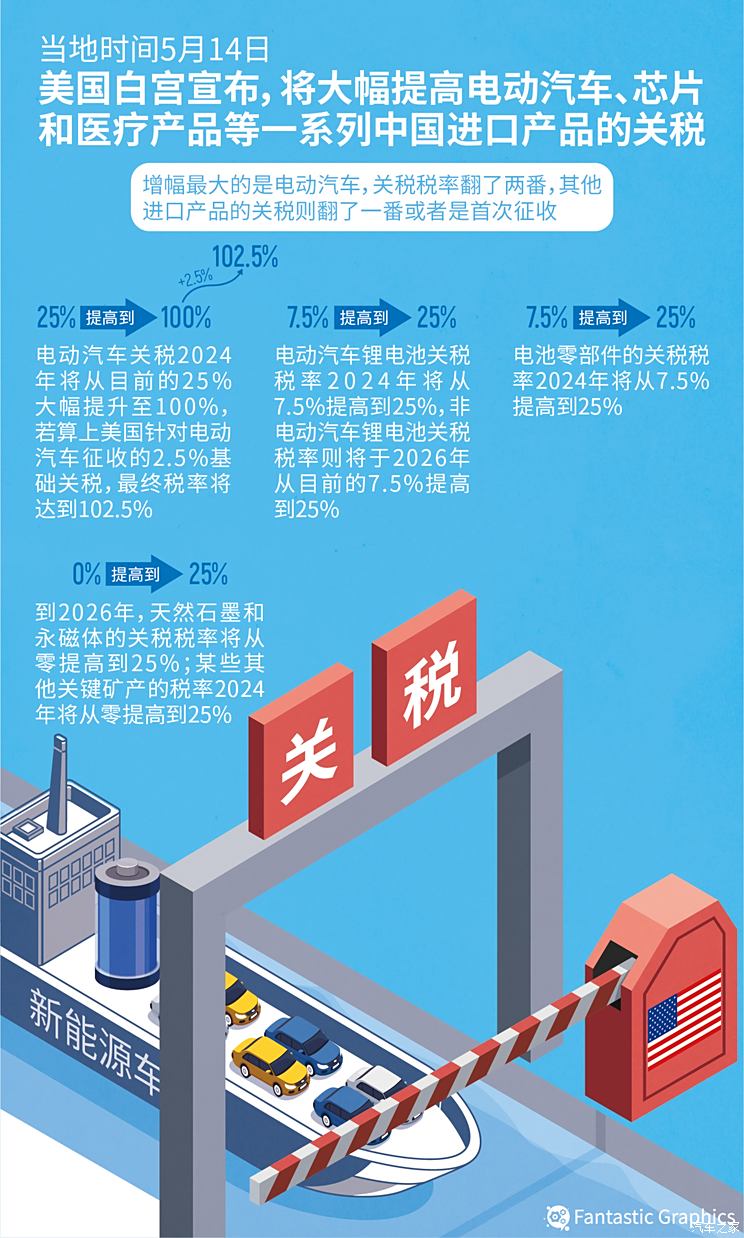 [本站 资讯] 当地时间5月22日,美国贸易代表办公室宣布,根据美国总统指示,该办公室经研判后决定:维持特朗普政府时期对华征收的“301条款”关税,同时对中国“目标战略产品”大幅提高关税。其中,电动汽车及其电池、半导体、钢铁铝产品等一系列产品的进口关税新规于今年8月1日生效。