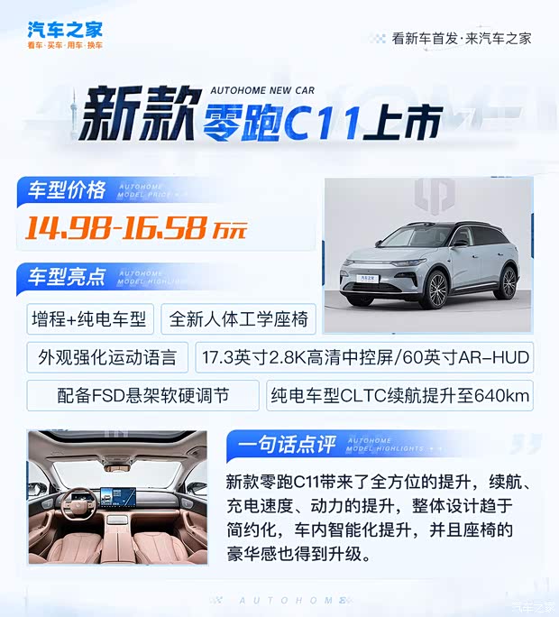 [本站 新车上市] 7月10日,新款零跑C11正式上市,新车共计推出5款车型,售价14.98-16.58万元。新款车型将实现全域800V架构,640km续航,配备激光雷达,实现端到端辅助驾驶,全系拥有前双叉臂后五连杆悬架和FSD悬架软硬调节,新车定位为一款中型SUV,包括增程和纯电车型。同时,官方在现场公布A、B、C、D四大系列产品矩阵以及各系列产品规划。关于新车详细售价及上市权益,见下图: