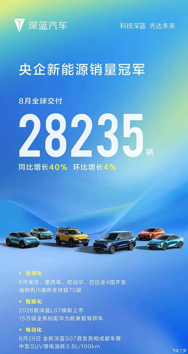 就在月初,深蓝品牌公布其8月全球交付28235辆,同比增长40%,环比增长4%。与此同时,深蓝L06将在9月8日完成亮相。其采用全新的设计风格,其车身尺寸方面,车辆长宽高分别为4830/1905/1480mm,轴距为2900mm。