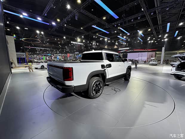 车身侧面,新车采用了双排座设计,并配备宽厚的前后轮眉与翼子板,且形成了宽体的视觉效果。同时车顶行李架以及龙门架等配置则提升了整车的越野氛围。新车还配备18英寸轮圈采用花瓣式造型。
