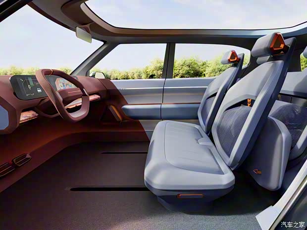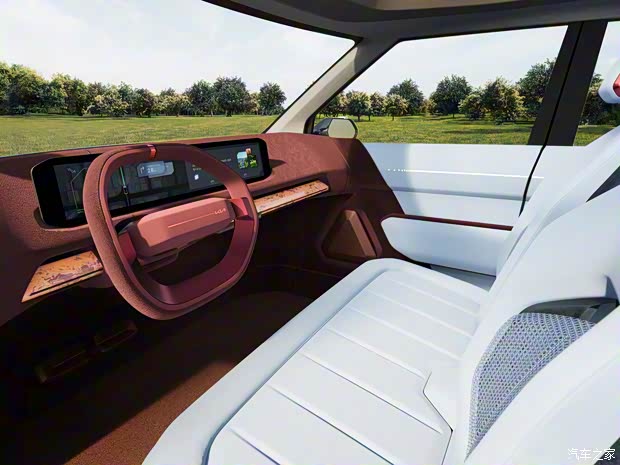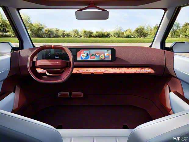 车辆内饰十分简约,双幅式方向盘前方采用双联屏设计,车辆座椅采用一体式设计,且并无中央扶手等。后排座椅椅垫可以向上抬起,配合前排座椅超长的滑轨,展现了起亚工程师对车内空间的构思。