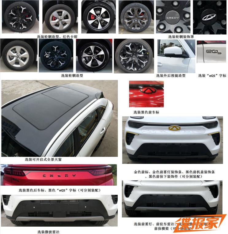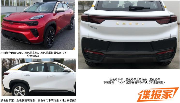 新款车型与现款大蚂蚁的外观保持一致,依旧采用前卫的外观设计理念,分体式头灯辨识度很高。新款车型根据配置不同,可选装不同的轮圈、红色卡钳、以及黑色和金色的“eQ5”标志、前车标、后车标,以及金/黑色前雾灯装饰条等装饰,进一步增加新车的质感。