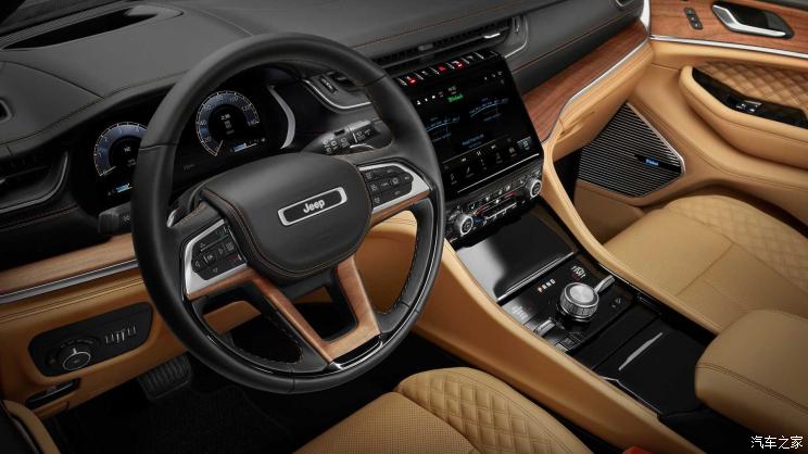 新一代大切诺基L内饰的变化是非常彻底的,中控台采用对称式设计,并配备有10.3英寸全液晶仪表盘,中央控制屏幕标配8.4英寸,并提供10.1英寸可选,并内嵌UConnect 5娱乐信息系统,支持苹果无线CarPlay和Android Auto以及4G LTE Wi-Fi热点。同时新一代车型的亮点在于提供三排座椅设计,标配为2+2+2式六座布局,其中第二排座椅还配备有扶手,提供更强的舒适型。当然在配置方面,全车还提供12个USB和USB-Type C接口,19扬声器音响、自适应巡航、夜视系统、以及L2级别的自动驾驶辅助系统等。