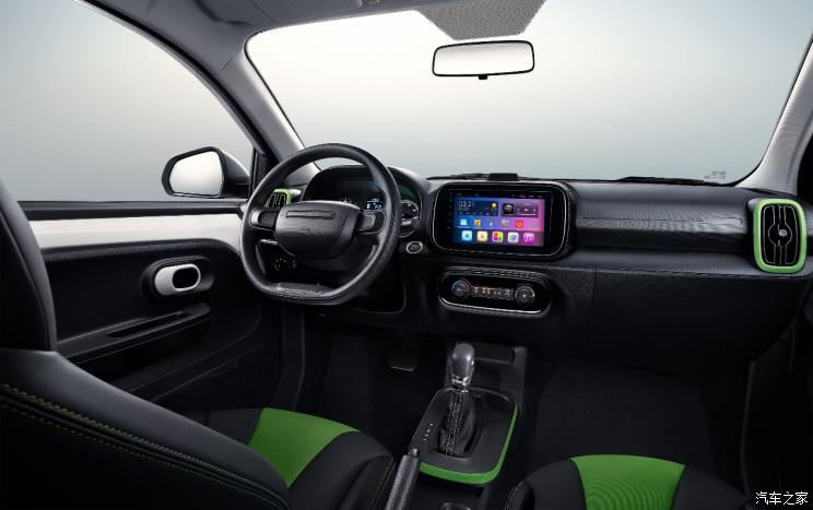 内饰方面,新车整体采用黑色作为底色,但在出风口、座椅处都有着荧光绿色作为装饰。作为入门微型纯电车,其采用了双辐方向盘和指针式仪表盘,中控区域也仅有造型简单的多媒体系统。配置方面,新车将配备一体式皮质运动座椅、开关门车窗防耳鸣智能升降、高保真扬声器音响系统以及全车隔热绿玻璃等配置。