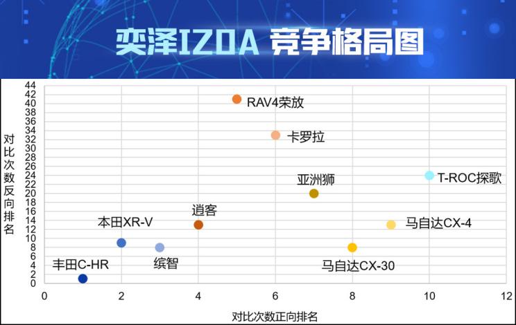 本站大数据中不同车系间的相互对比次数能够很好地反映用户心目中车系的竞争关系。根据本站上的车型对比数据,与奕泽IZOA进行对比的车系中,对比次数位列Top 3的竞品分别为丰田C-HR、本田XR-V、缤智,我们将其视作奕泽IZOA的核心竞品。可以看出,对奕泽IZOA来说,丰田C-HR对其用户的争夺最为激烈。